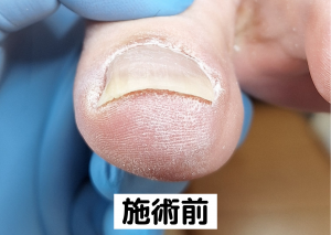 表面的な痛みは早期に改善しましたが、爪の根元部分に強い巻き込みが残存しており、構造的に再発しやすい状態であることが確認されています。